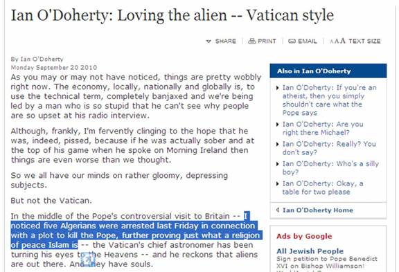 “I noticed five Algerians were arrested last Friday in connection with a plot to kill the Pope, further proving just what a religion of peace Islam is” [Irish