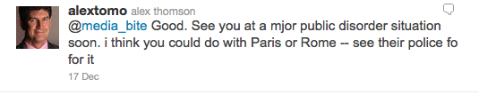 Here Thomson evokes a picture of protesters as a wild, unpredictable gang moving in packs. Speaking very generally about all protesters, he says, the mood (which he reveals later in the piece he derived from what he overheard or saw, in fact there is no reference to actual interaction with protesters in any of his blog entries) was “[r]adically different” and protesters were “masked up” as opposed to wearing scarves etc. Thomson is adamant this indicated protesters were “plainly out for a ruck“. This use of language, masked up* and out for a ruck sounds slightly like that which might be used in gang discourse, with Thomson, in one sense, identifying the perceived source of the potential violence, and in another, identifying himself with an opposing side, the police. This closely chimes with the type of identification typical of correspondents embedded with the military in war zones.