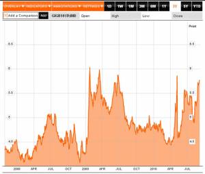 The graph shows the 10-year bond yield for Irish government bonds (essentially the cost of borrowing), which looks fairly dramatic, until you look at the same data over a longer time frame, in this case the last 3 years: